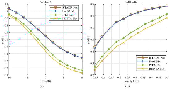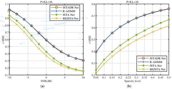 NR dataset. (a) r-MSE versus SNR (dB) of ISTADR-Net, R-ADMM, ISTA-Net, and BEISTA-Net when , , and . (b) r-MSE versus sparsity level of ISTADR-Net, R-ADMM, ISTA-Net, and BEISTA-Net when , , and .