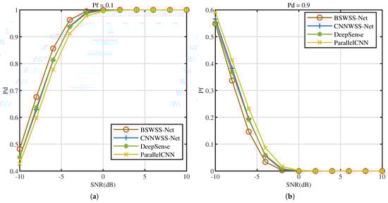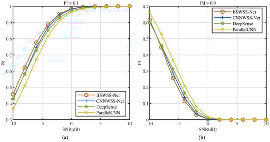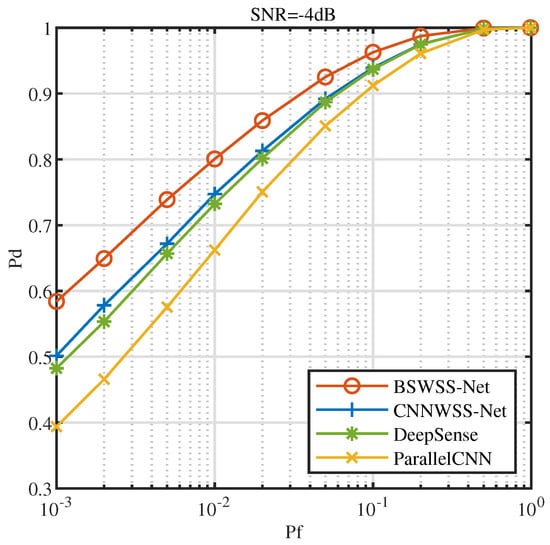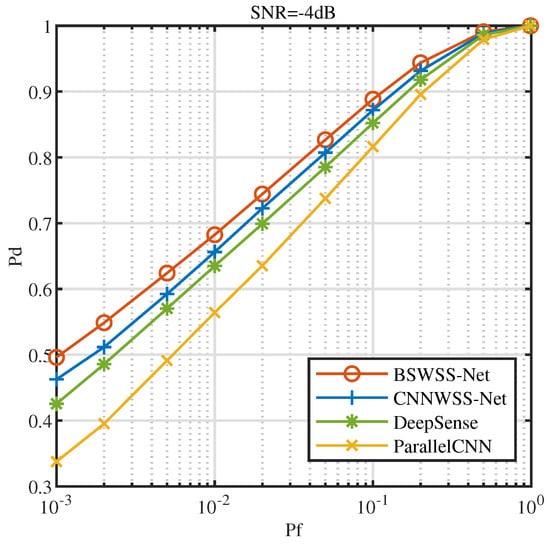 Figure 10 illustrates the receiver operating characteristics (ROC) at . It is evident that as the false alarm probability increases, the detection probability of all four algorithms also increases. Under the same conditions, BSWSS-Net consistently achieves the highest detection probability. Specifically, when , the detection probability of BSWSS-Net nearly reaches 0.9, essentially meeting the requirements of cognitive radio. This observation clearly demonstrates that the detection performance of the BSWSS-Net algorithm surpasses that of the other three algorithms.