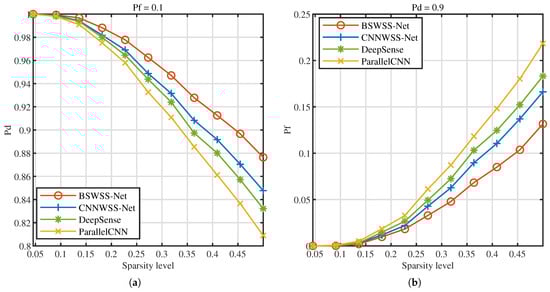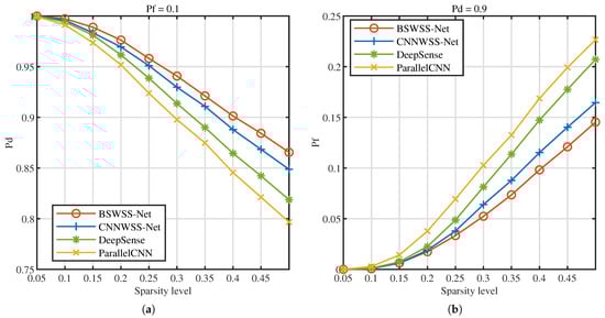 Next, the impact of signal sparsity level on detection performance is evaluated in the TVWS dataset. Figure 9a illustrates the versus sparsity level at , Figure 9b illustrates the versus sparsity level at . It is distinctly observable that with the augmentation of signal sparsity, the detection probabilities of the four spectrum-sensing algorithms diminish, while the false alarm probabilities escalate. This phenomenon can be attributed to the fact that higher signal sparsity implies a greater number of users within the same bandwidth, leading to increased signal complexity, which consequently degrades detection performance. At a sparsity level of 0.05, the detection probabilities of the several algorithms approximate 1, and the false alarm probabilities are nearly 0. When the sparsity reaches 0.5, the BSWSS-Net achieves a detection probability of approximately 0.86 and a false alarm probability of about 0.15. Under identical conditions, CNNWSS-Net, DeepSense, and ParallelCNN exhibit detection probabilities significantly lower than that of BSWSS-Net, and their false alarm probabilities are notably higher. In summary, the proposed BSWSS-Net attains excellent detection performance across varying sparsity levels.