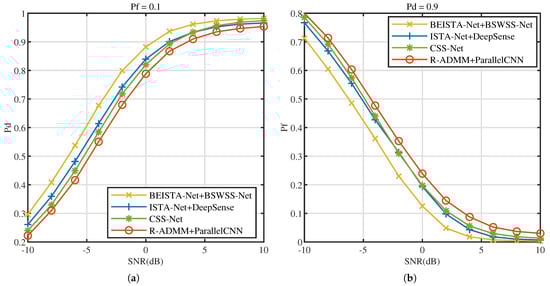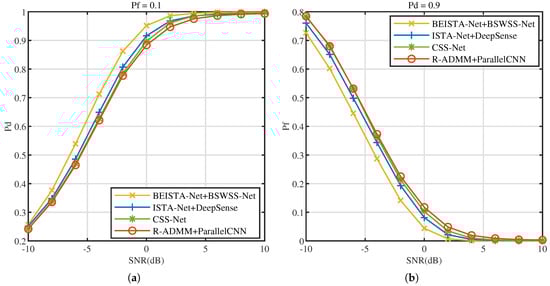We evaluate the performance in the TVWS dataset, with and . The effect of SNR on the CSS algorithms is studied. Figure 14a illustrates the versus SNR at , Figure 14b illustrates the versus SNR at . As SNR increases, the performance of all four algorithms progressively improves. Notably, when SNR increases from −10 dB to 10 dB, the performance of BEISTA-Net+BSWSS-Net joint algorithm consistently surpasses that of the other three algorithms. When , the detection probability can meet the requirement of , while . Compared to standalone WSS algorithms, the performance of CSS algorithms is slightly worse. This is because the reconstruction algorithm introduces some reconstruction errors, which affects the overall accuracy. The aforementioned experimental results demonstrate that the proposed BEISTA-Net+BSWSS-Net joint algorithm maintains robust detection performance under varying SNR conditions.