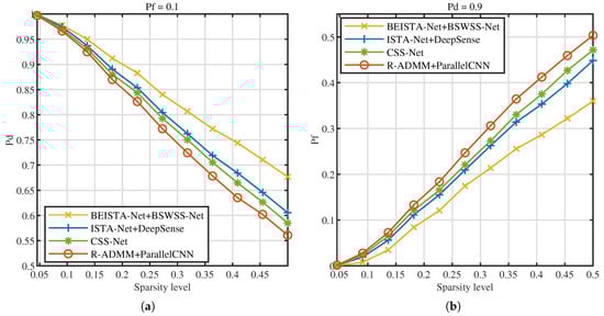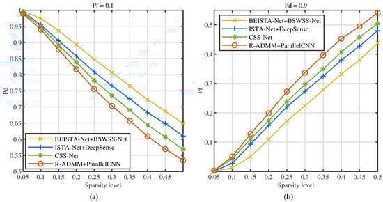 Next, the influence of signal sparsity levels on detection performance is investigated. Figure 15a illustrates the versus sparsity level at , Figure 15b illustrates the versus sparsity level at . As the sparsity level increases, the detection probabilities of the four joint algorithms decrease, while the false alarm probabilities rise. This phenomenon occurs because, with higher sparsity levels, the number of users contained in the signal increases, leading to greater signal complexity and, consequently, higher detection difficulty. Under the same sparsity level, the BEISTA-Net+BSWSS-Net joint algorithm achieves the highest detection probability and the lowest false alarm probability. Specifically, when the sparsity level is 0.05, the detection probability of the BEISTA-Net+BSWSS-Net joint algorithm is approximately 1, and the false alarm probability is nearly 0. When the sparsity level reaches 0.5, the detection probability of the BEISTA-Net+BSWSS-Net joint algorithm remains around 1, while the false alarm probability increases to approximately 0.45. Compared to the corresponding WSS algorithms, this represents a noticeable decline in detection performance, primarily due to the significantly reduced information obtained from compressive sampling, which degrades the quality of the reconstructed signal. Overall, the proposed joint CSS algorithm demonstrates robust performance across varying sparsity levels.