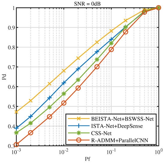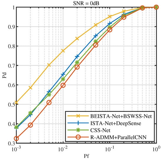Figure 16 illustrates the ROC at . From the figure, it is clear that BEISTA-Net+BSWSS-Net significantly outperforms ISTA-Net+DeepSense, CSS-Net, and R-ADMM+ParallelCNN. At , for BEISTA-Net+BSWSS-Net is 88.23%, while ISTA-Net+DeepSense achieves 83.95%, CSS-Net achieves 82.02%, and R-ADMM+ParallelCNN achieves 78.82%. Compared to the current state-of-the-art algorithms, the is improved by 4 percentage points when and .