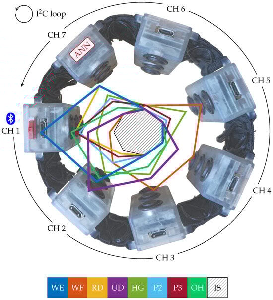 Armband device structure: the representation shows the 7 channels (CH 1–CH 7) and the wired (I2C) and wireless (BLE) communication protocols implemented. The overlapped profiles represent the ATC values distribution for the nine hand gestures recognized by the system: wrist extension (WE), wrist flexion (WF), radial deviation (RD), ulnar deviation (UD), hand grasp (HG), thumb–index finger pinch (P2), thumb–middle finger pinch (P3), open hand (OH), and idle state (IS). The ATC profiles are based on the data acquired on 20 subjects in our previous work [28].