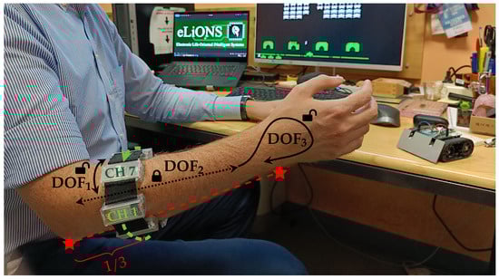A general user wearing our custom sEMG armband. Considering its three degrees of freedom (i.e., DOF1—rotation around the forearm, DOF2—lengthwise position, and DOF3—reversed insertion), the proposed embedded calibration algorithm is able to compute both DOF1 and DOF3 information, making the wearing of the device easier than searching for the exact reference position. The forward and backward shift of the armband along the forearm (DOF2) is instead fixed one-third along the length from the elbow to the wrist in order to sense the muscular signals where muscle bodies are more accessible.