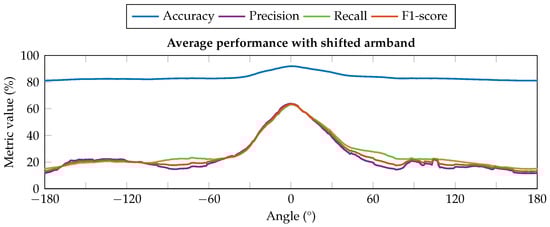 Classifier performance with different artificial shift conditions of the input data. All the metrics suffer a relevant decrease in their values when the armband is rotated by about ±30° from the reference position (0°), significantly impacting the reliability of the classification outcomes.