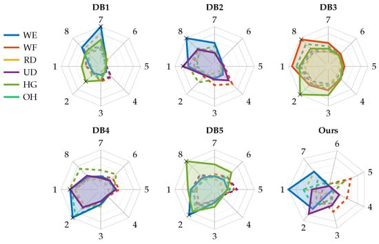 As introduced above, our proposed solution aims to correct the angular shift and reversal condition of sEMG-based armbands for hand gesture recognition. To define a correction algorithm suitable for our case study and generalizable to other devices, we performed an analysis leveraging the first five Ninapro databases [39,40], namely DB1, DB2, DB3, DB4, and DB5. The analysis thus involved data acquired with OttoBock [44], Delsys [45], and Cometa [46] double-differential sEMG electrodes and with the Myo armband [4]. We chose to include the Myo armband in this analysis because of its widespread use [47,48,49,50,51], but we acknowledge that the Myo armband has a poor sampling frequency of 200 and is therefore susceptible to aliasing, as the sEMG signal has the greatest frequency contribution in the 50–150 range [52]. A previous study [53] also showed how a sampling frequency of 200 , compared with 1000 , results in a drastic reduction in classification performance. For the purpose of the analysis, only sensors arranged around the forearm at the height of the radio humeral joint, following a circular configuration, were considered, thus excluding those placed on the biceps brachii and triceps brachii, or on the specific spots of the flexor and extensor digitorum superficialis, and considering only one armband in cases where two were used. Therefore, the first eight channels of each database were involved in this investigation. Among all the gestures included in the Ninapro databases [39], our analysis considered only the most meaningful gestures for a calibration routine, i.e., open hand (exercise B, gesture 5), hand grasp (exercise B, gesture 6), wrist flexion (exercise B, gesture 13), wrist extension (exercise B, gesture 14), radial deviation (exercise B, gesture 15), and ulnar deviation (exercise B, gesture 16), and thus excluding selective finger movements. To expand our analysis beyond healthy subjects, we also included data from the subjects with amputations included in DB3, of whom we considered only people with right-hand amputations for consistency with the other databases where data acquisition was performed on the right arm. The attributes of each database involved in this investigation are summarized in Table 1. For each Ninapro database, the RMS profiles of the provided sEMG signals were computed as the indicator of muscle activity, with the only exception of DB1 where the provided signals are already RMS profiles. The RMS was computed over sliding windows of 200 , with a moving step equal to 10% of the window length, i.e., 20 . Then, the RMS signals were segmented according to the provided restimulus labels, and the median of the RMS values was computed for each movement, for each channel, analogous to what was done with the ATC values in our database [28] to identify the ATC profiles distribution across the channels shown in Figure 1. The results of this process are reported in Figure 4, showing the activation profiles of each channel for each Ninapro database under analysis and for our ATC database. Since the signal amplitude ranges of each database differ from each other either because of the use of different acquisition systems or due to the presence of people with amputations, the values of each radar chart in Figure 4 was normalized with respect to the maximum value plotted in each. We chose to use RMS and not to software-extract ATC from the databases under analysis because, as mentioned, ATC is not a requirement to assess the armband orientation; we use it here because it is the feature used by our device, but its software extraction does not necessarily reflect what can be obtained in hardware (the sampling frequency negatively affects the ATC quality). The only requirement for choosing the feature to be used for orientation estimation is its high correlation with muscle activity level.