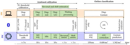 Software (SW) and firmware (FW) interconnected operations for the calibration and online classification working phases. The green blocks represent the new steps for estimating the orientation of the device and for correcting the sensed values before performing the classification. All the algorithm computations are embedded on the armband modules’ MCUs while the SW package runs the graphical user interface (GUI), helping the user to follow the indications for a straightforward experience. The bottom timeline also reports the developer-defined calibration protocol timings and the (*) system latency measured during experimental validation.