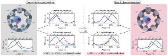The second stage, the reversal assessment, starts directly at the end of the previous one and, by processing the ATC data acquired for both WE and UD movements, verifies their relative position. As graphically represented in Figure 7, the UD profile is shifted one channel forward and backward, and the respective MAE (i.e., MAEfw and MAEbw) with WE are computed. According to (1) in the case of flagbw equal to 1, since with the standard orientation the UD peak would be located one channel after the WE peak (Figure 7, case A), MAEbw should be lower than MAEfw when the armband is worn in the original direction. If MAEbw is greater than MAEfw (Figure 7, case B), a reversal condition is detected, the corresponding boolean variable is set (Reversal = true), and all the ATC profiles henceforth acquired will have their values swapped to restore the correct shape w.r.t. the reference profile.