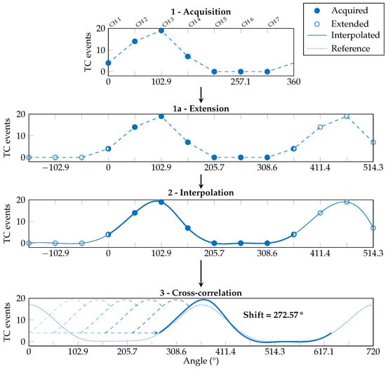 The third stage, named shift assessment, runs immediately after computing the reversal condition and performs the evaluation of the angular shift involving only the WE profile. Following the steps reported in Figure 8, before proceeding with the cubic spline interpolation, the acquired median WE profile (step 1) is extended by replicating three values before and after its original domain (step 1a) to ensure that the slopes at the interpolated profile tails are correct. After the interpolation is performed (step 2), only the values between 0° and 360° (i.e., number of channels × Ninterp = 70 points) are considered.