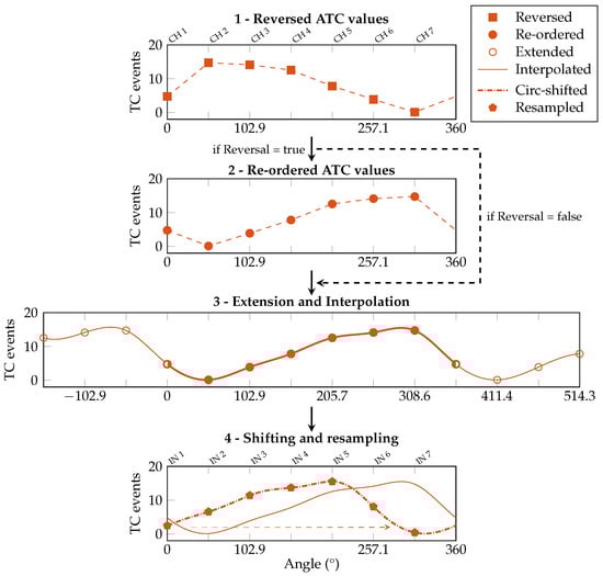 ATC signal correction during real-time operations. First, if Reversal = true, values are symmetrically swapped w.r.t. CH 1 (i.e., CH 2 with CH 7, etc.). Then, the signal undergoes steps 1a and 2 of the shift assessment process. Lastly, the signal is shifted the saved amount of degrees, and resampled with the original channel distance to obtain the seven values (IN 1–IN 7) needed as input by the ANN (4).