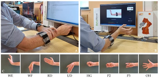 Validation protocol: (A) the armband is worn on the right forearm with arbitrary orientation; (B) calibration gestures are performed to determine reversal and shift conditions; (C) standard gestures are executed to verify the system performances. The testing protocol maintains the same organization of our previous study [28].