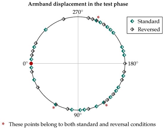 The average accuracy and F1-scores achieved were % and %, respectively. Compared with what was reported in Figure 3, where for angular offsets greater than 30° the average accuracy and F1-scores were about 83% and 20%, the new results achieved using the proposed correction algorithm allowed the performance to be slightly higher than those obtained complying with the reference position in our previous work [28] (i.e., average accuracy and F1-scores equal to % and %). This slight performance increase w.r.t. our previous work revealed how the proposed algorithm, with a resolution of °, is also able to take into account minimal variations of the armband placement from the reference position, which in our previous work were left to the users’ ability to properly wear the device.