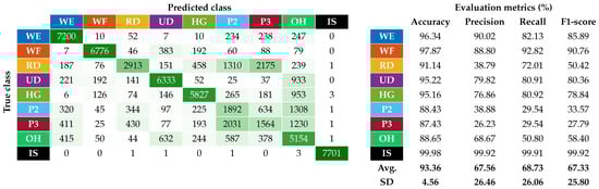 The first step was to examine how the classifier worked after the correction of the ATC input data. The test phase included a total of 50 trials (i.e., 25 people times two session repetitions), covering 42 different combinations of shift and reversal conditions, with the distribution depicted in Figure 11. The resulting confusion matrix for the nine classified hand gestures is reported on the left of Figure 12, while the table on the right shows the related metrics with their averages and standard deviations (SDs). In particular, we calculated the accuracy, prediction, recall, and F1-score for each class (c) as defined below:
