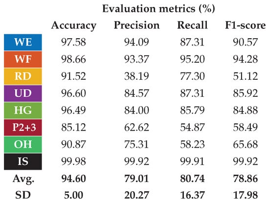 Nevertheless, the overall performance can be improved with few changes. The first is the merging of pinch classes P2 and P3, analogous to what was done in [28]. The second involves using short moving windows to strengthen the outgoing class, which is assigned only if the last three predicted classes agree. The results of these two approaches combined are shown in Figure 13, where the average precision, recall, and F1-score are increased by about 17% compared with those reported in Figure 12, with also a decrease in their standard deviation. The use of these approaches in a practical application context was demonstrated in [56].