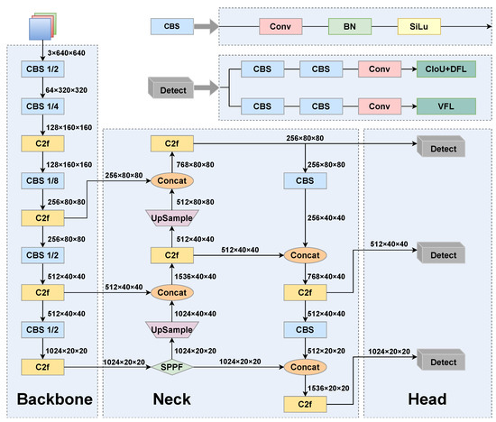 In this study, we selected YOLOv8 as the baseline network for improvement due to its simple structure and stable detection accuracy. Figure 1 shows the architectural layout of YOLOv8, which is segmented into three primary components: