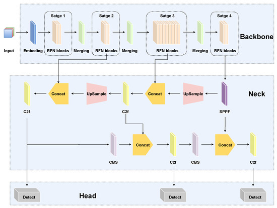- The RFN block is integrated with FasterNet to construct a robust backbone network. This network effectively balances semantic information across multi-resolution feature maps through staged downsampling and a hierarchical arrangement of RFN blocks, ensuring comprehensive feature representation at different scales.