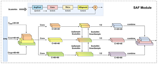 The YOLOv8 detection head plays a critical role in the object detection pipeline, producing final detection results by processing multi-scale feature maps extracted by the FPN. The detection head processes feature maps at three distinct scales, with spatial resolutions of 80 × 80, 40 × 40, and 20 × 20, corresponding to the detection of small objects (larger than 8 × 8 pixels), medium objects (larger than 16 × 16 pixels), and large objects (larger than 32 × 32 pixels), respectively. This multi-scale design enables the model to effectively handle objects of varying sizes. However, this multi-scale detection approach encounters two significant challenges that can degrade detection performance. First, low-resolution feature maps often fail to capture fine-grained details of small objects, resulting in inaccurate localization and reduced detection confidence. Second, in high-resolution feature maps, the dominant feature responses of large objects can suppress the weaker responses of small objects, particularly due to the spatial influence of large objects on neighboring regions. This phenomenon significantly compromises the detection and classification accuracy of small objects. To mitigate these challenges, we propose a SAF module, which is integrated before the detection head of RFAG-YOLO to enhance multi-scale feature representation. The SAF module facilitates adaptive feature processing across different scales by dynamically weighting and integrating information from all three resolution levels. This approach significantly improves the model’s ability to localize and classify objects, particularly small objects, with higher accuracy.