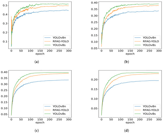 Figure 8 shows the performance trends of YOLOv8n, RFAG-YOLO, and YOLOv8s during training. It can be observed that throughout the training process, the performance of the RFAG-YOLO model consistently surpasses that of YOLOv8n, and its performance curve is closer to that of YOLOv8s. This indicates that RFAG-YOLO not only performs well in terms of the final performance but also exhibits higher stability during training. Additionally, as the number of training epochs increases, the performance improvement of RFAG-YOLO becomes more significant, ultimately reaching a higher accuracy level, which suggests that the model has a stronger ability to learn from complex scenarios.