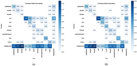 Normalized confusion matrices comparison between different models on the VisDrone2019 dataset. (a) Confusion matrix of YOLOv8n model. (b) Confusion matrix of our proposed RFAG-YOLO model.