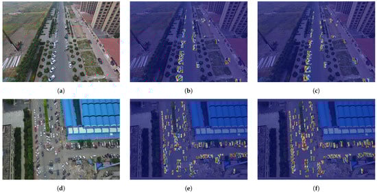 Comparison of detection heatmap visualization on the VisDrone2019 dataset. (a,d) Original drone-captured images showing complex parking scenarios. (b,e) Heatmap visualization of YOLOv8n detection outputs. (c,f) Heatmap visualization of our proposed RFAG-YOLO detection outputs.