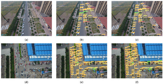 Comparison of object detection results on the VisDrone2019 dataset. (a,d) Original drone-captured images showing complex parking scenarios with multiple vehicles. (b,e) Detection results obtained by YOLOv8n. (c,f) Detection results obtained by our proposed RFAG-YOLO model.