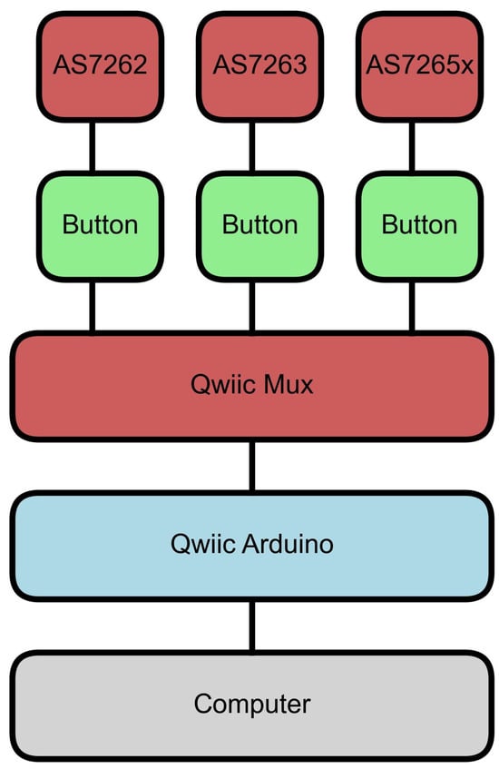 Diagram of device setup. A Qwiic button was connected to each of the sensors, AS6272, AS7263, and AS7265x. All sensors were then connected to a Qwiic Mux, which was connected to an Arduino with a Qwiic cable. Finally, the Arduino was connected to a computer.