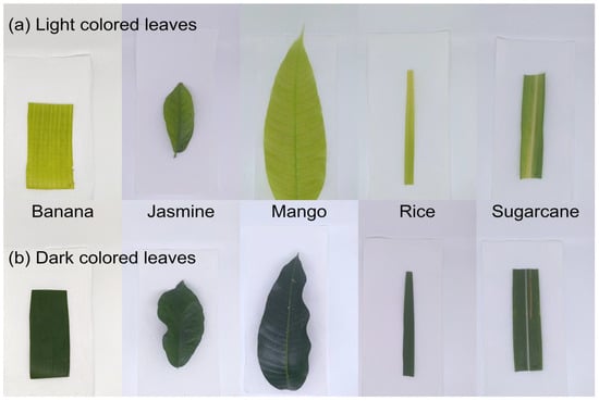 Photographs of leave samples. Photographs of leaf samples arranged in two rows: (a) the top row shows light-colored leaves, which are younger, newly emerging leaves, and (b) the bottom row shows darker-colored leaves, which are older leaves. The samples for banana, jasmine, mango, rice, and sugar cane are arranged from left to right.