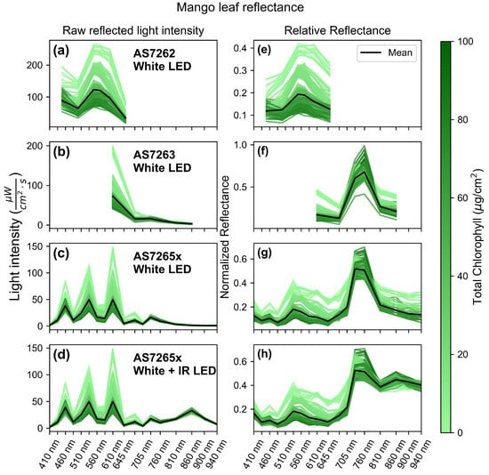 Figure 4 shows the leaf spectra, taken in triplicate, of mango leaves measured by all three sensors. The left column (Figure 4a–d) shows the raw, unnormalized light intensity readings from the sensors, while the right column (Figure 4e–h) displays the reflectance normalized to the reference, a white sheet of A4 paper. The x-axis is shared across all figures to compare the spectral regions measured by each sensor. The black lines represent the mean spectra for each leaf–sensor combination. Each spectrum is color-coded to illustrate the chlorophyll level of the associated leaf, according to the color bar on the right. Leaves with lower chlorophyll levels have a higher overall reflectance due to lower chlorophyll content, a thinner outer-surface cuticle, and less developed cell structures [56].