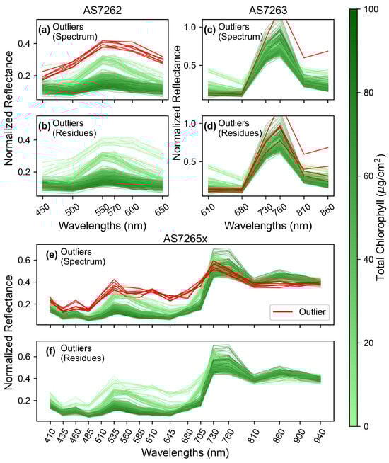 Outlier detection using Mahalanobis distances. (a,c,e) Outliers identified, in red, from the original spectrum. (b,d,f) Outliers identified, in red, from the residue spectrum, calculated as the difference between each individual measurement and the average of the other two measurements on the same leaf; for the sensors: (a,b) AS7262, (c,d) AS7263, and (e,f) AS7265x. Outliers are shown in red, and non-outliers are shown in green, color-coded by chlorophyll levels as indicated by the color bar. The x-axis labels indicate the spectral channels for each sensor.