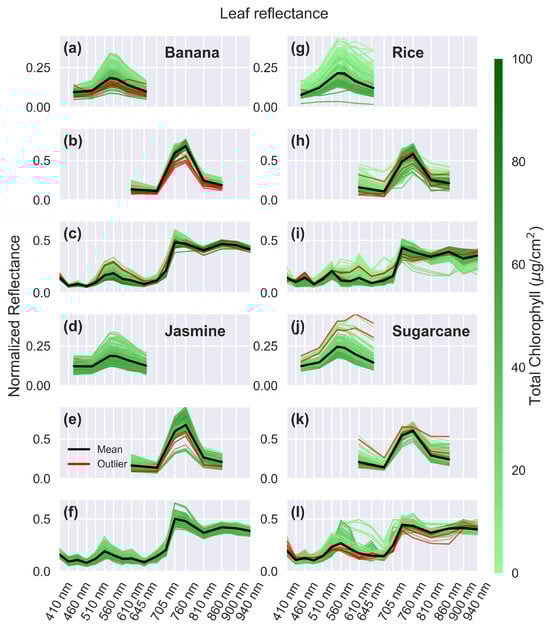 Reflectance with outliers. Relative reflectance for leaves: (a–c) banana, (d–f) jasmine, (g–i) rice, and (j–l) sugarcane, measured using the sensors AS7262 (a,d,g,j) with a white LED, AS7263 (b,e,h,k) with a white LED, and AS7265x (c,f,i,l) with a white and IR LED. Outliers are shown in red, individual spectra are color-coded according to their chlorophyll levels, and the mean spectrum is shown in black. The x-axis remains consistent across all graphs, with grid lines indicating the AS7265x spectral channels.