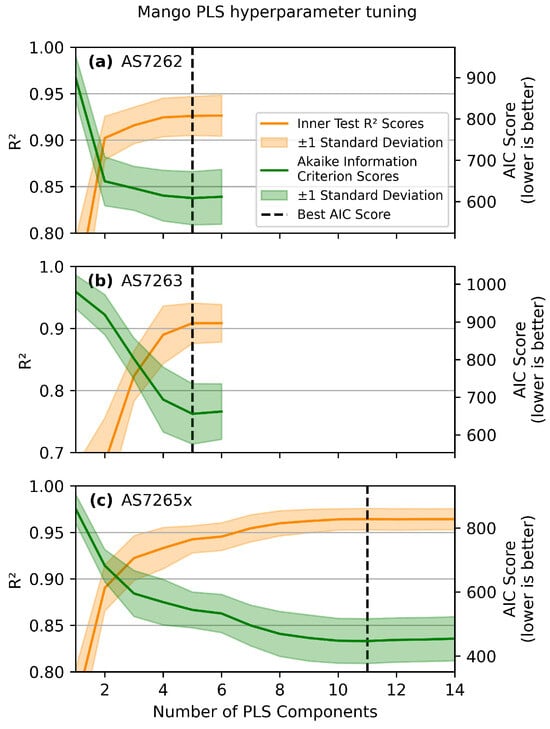 To optimize a PLS model, the number of LVs must be carefully selected to balance model complexity and predictive accuracy. Increasing the number of LVs will increase a model’s fit to the training data and possibly to the test data, but it can lead to overfitting, reducing its ability to generalize to new data. The Akaike Information Criterion (AIC) was used to determine the optimal number of LVs. The AIC considers the model’s goodness of fit, the number of data points, and complexity (in this case, the number of LVs) [60]. A lower AIC score indicates a better balance between the model’s goodness of fit and complexity.