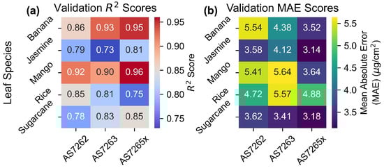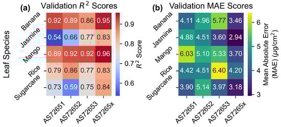 The heatmaps in Figure 8 display the and MAE values for the outer CV validation scores from the PLS parameter scans. As expected, the AS7265x sensor, with a larger number of channels, had the best fit for all leaves except rice, which will be discussed later. The AS7265x showed MAE values around 3.5 , and scores ranging from 0.96 to 0.81, for leaves other than rice. AS7262 and AS7263 performed similar to each other with MAE values between 3.4 and 5.6 and scores in the range of 0.93–0.73, with a large performance difference between leaves. The performance of each individual leaf species will be discussed in the next section.