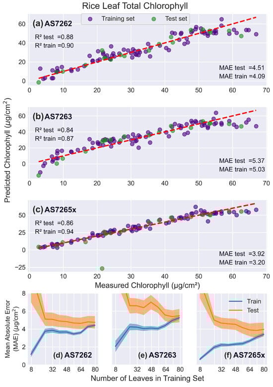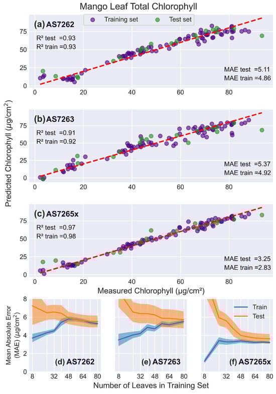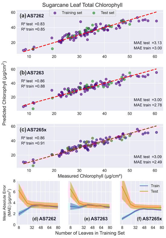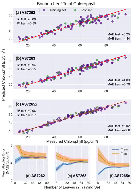 Sugarcane leaf results. PLS model fits to sugarcane leaves. (a–c) Predicted versus actual chlorophyll levels for the sensors: (a) AS7262, (b) AS7263, and (c) AS7265x, with the red dashed line representing a perfect fit. (d–f) Learning curves showing the MAE as a function of the number of leaves in the training set, for the sensors: (d) AS7262, (e) AS7263, and (f) AS7265x. Training scores are shown in blue, and test scores in orange, with shaded areas representing the standard deviation.