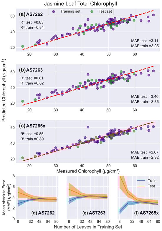 Figure 9 presents the results of fitting the spectral data to PLS models. Figure 9a–c show actual versus predicted chlorophyll levels for a single test (green) and training (purple) split for the AS7262 (Figure 9a), AS7263 (Figure 9b), and AS7265x (Figure 9c) sensors. Figure 9d–f shows the learning curves that plot the MAE for the testing and training sets as a function of the number of leaves used to train the PLS model.