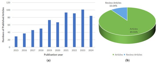 Between 1 January 2015, and 31 December 2024, 647 articles focusing on the application of wearable sensors for fall detection were retrieved from the SCI and SSCI indexes. Of these, 582 were research articles and 65 were review articles. From 2019 to 2024, the annual publication count did not exceed 60 (Figure 2a). However, a notable increase occurred in 2021 and 2022, with publications surpassing 90 in each of these years. The year 2023 saw the highest publication count of the decade, exceeding 100 papers. Figure 2b demonstrates that 89.96% of the documents are research articles, while 10.04% are review articles, suggesting a predominant focus on primary research contributions, with a smaller proportion dedicated to synthesizing existing knowledge.