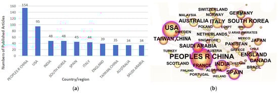 Analysis of the distribution of published articles by country/region in terms of global research productivity and influence in wearable sensors for fall detection: (a) top 10 productive countries/regions; (b) network visualization map.
