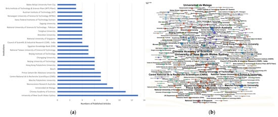 Analysis of the distribution of published articles by institution in terms of global research productivity and influence in wearable sensors for fall detection: (a) top 25 productive institutions; (b) network visualization map of the institutions.