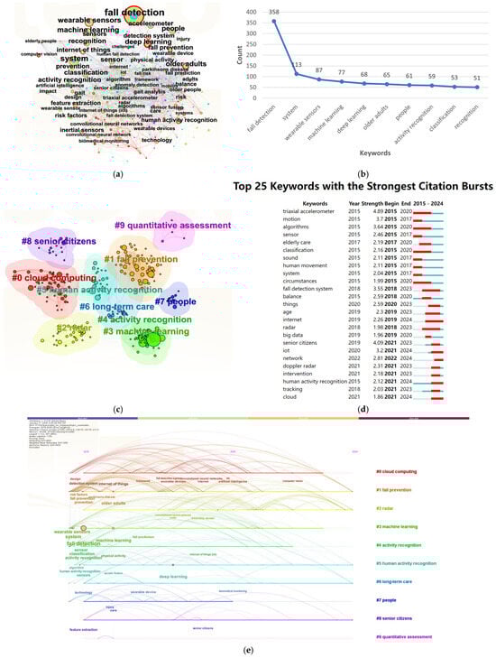 Analysis of the distribution of keywords related to wearable sensors for fall detection: (a) network visualization map of keywords; (b) top 10 keywords for wearable sensors for fall detection; (c) cumulative occurrences of selected keywords from 2015 to 2024; (d) top 25 keywords with the strongest citation bursts in academic research (2015–2024); and (e) timeline chart for the period of 2015–2024.