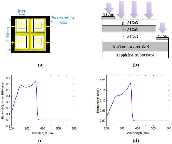 - Collins, C.J.; Chowdhury, U.; Wong, M.M.; Yang, B.; Beck, A.L.; Dupuis, R.D.; Campbell, J.C. Improved Solar-Blind Detectivity Using an AlxGa1-xN Heterojunction p-i-n Photodiode. Appl. Phys. Lett. 2002, 80, 3754–3756. [Google Scholar] [CrossRef]
