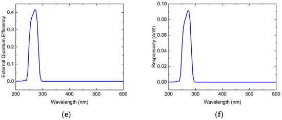 The detector employs a quasi-vertical structure (QVS). As shown in Figure 1b, the QVS features a vertically stacked p-AlGaN/i-AlGaN/n-AlGaN design, complemented by metal electrodes fabricated on lateral facets to establish a unique quasi-vertical carrier transport pathway. In contrast to conventional vertical structures limited by UV photon absorption losses in transparent conductive electrodes (e.g., ITO/IZO), the QVS eliminates the need for such electrodes, achieving an extremely high UV photon penetration efficiency. This enhancement is facilitated by the direct exposure of the photosensitive AlGaN layer to incident radiation. Critically, the QVS design significantly enhances the external quantum efficiency (EQE), a key metric quantifying the detector’s ability to convert incident photons into photogenerated carriers. As illustrated in Figure 1c, the EQE reaches 56.2% at 275 nm under zero bias, a great improvement over traditional vertical structures (EQE < 20%).