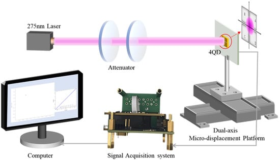 Schematic diagram of a solar-blind UV four-quadrant detector (4QD) based spot positioning system. The system consists of a laser beam emitted by a 275 nm laser, adjusted in intensity by attenuators, and directed to the 4QD, which is mounted on a dual-axis micro-displacement platform; the Signal Acquisition System collects the detector signals and transmits them to a computer for analysis and processing to achieve spot positioning.