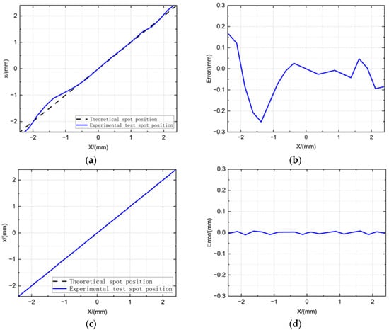 Comparative analysis between linear models (Figure 5a,b) and the optimized piecewise polynomial algorithm (Figure 5c,d) demonstrates substantial error mitigation: the maximum absolute positional error exhibits a 95.9% reduction (from 0.2519 mm to 0.0101 mm), while the root-mean-square error (RMSE) decreases by 94.3% (original: 0.1 mm; optimized: 0.0057 mm).