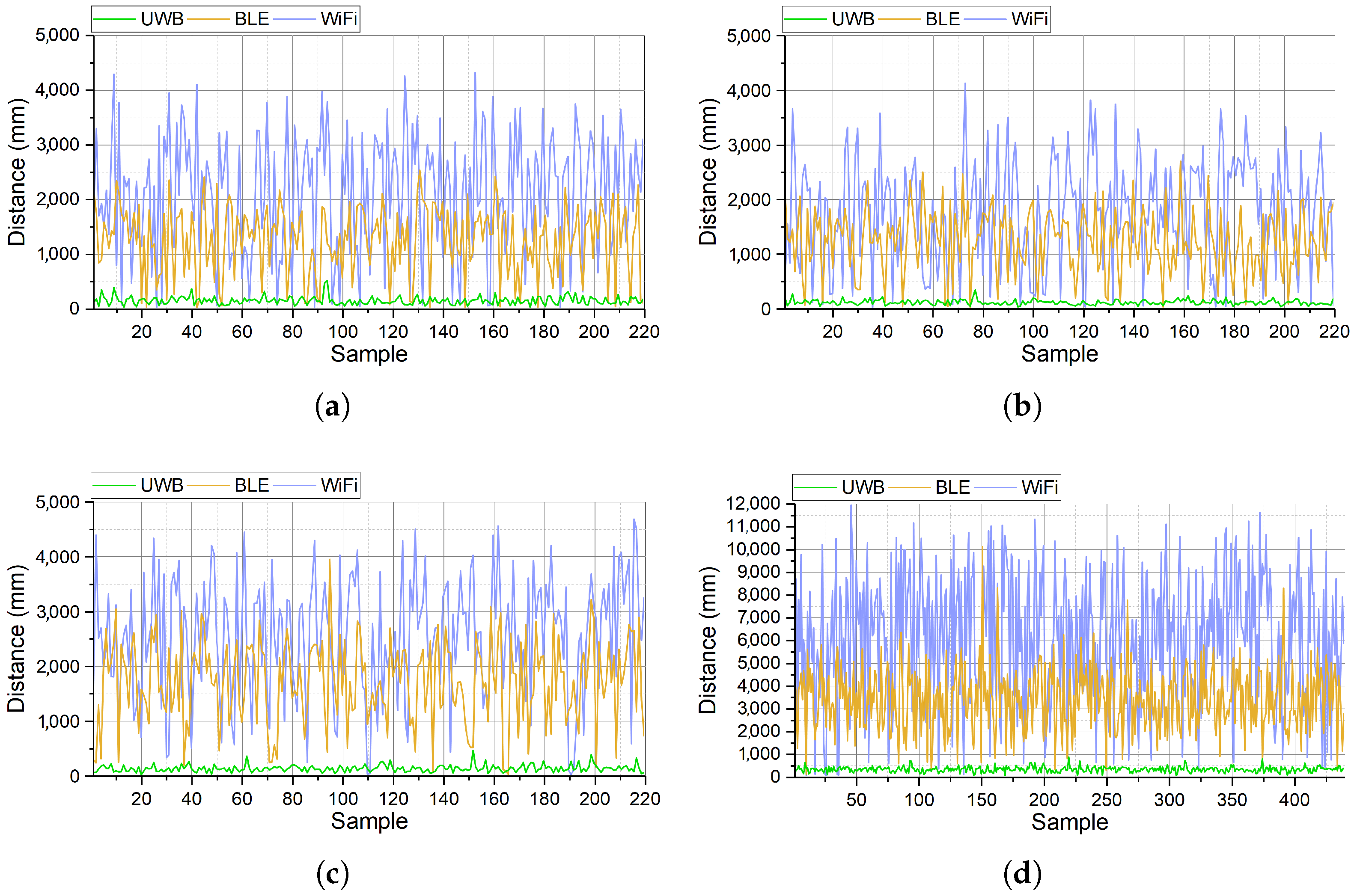 Furthermore, a hypothesis test can be applied to assess whether UWB’s superior accuracy is statistically significant. For instance, a one-way ANOVA or a t-test could be used to compare the error margins across different technologies. The null hypothesis () would state that there is no significant difference in localization accuracy among UWB, BLE, and WiFi, while the alternative hypothesis () would state that UWB provides significantly higher accuracy.