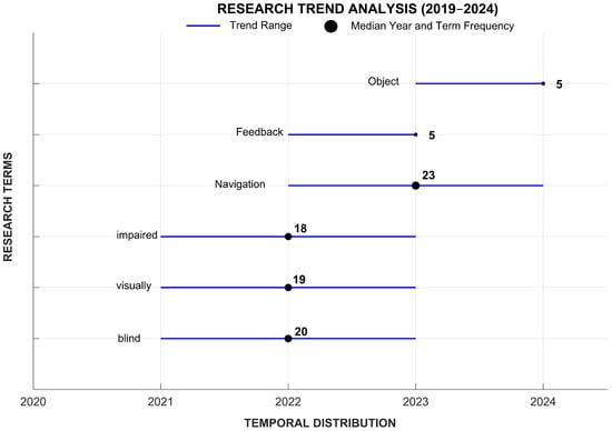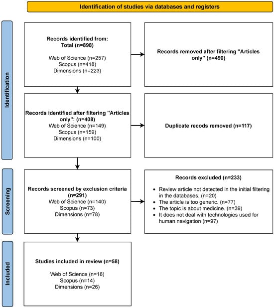 | Web of Science | TS = (“navigation*”) AND TS = (“technolog*” OR “device*”) AND TS = (“blind*”) AND PY = (2020–2024) AND DT = (Article) |