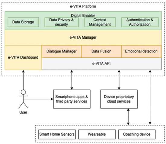 The e-VITA system is based on the Digital Enabler platform [27]. The platform is designed to handle data from heterogeneous devices, including smart home sensors such as temperature, humidity, and intrusion sensors, and wearable devices such as smart watches, smart bands, and smart rings. It also enables interaction with coaching devices such as social robots and holograms. Additionally, the platform provides capabilities for data storage, context management and overall communication with external systems. Special attention is paid to data privacy and security, as well as authorization. Figure 3 shows a high-level view of the e-VITA platform.