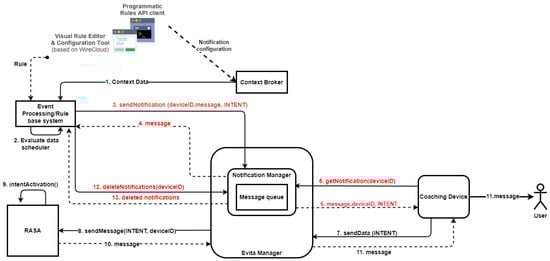 To initiate proactive dialogues based on the predicted user situations, the e-VITA system employs an Event Processing/Rule-based approach. This is implemented as a notification system which is integrated into the communication scheme among the different components of the e-VITA system. The architecture is presented in Figure 4, and the components in the notification system include the following: