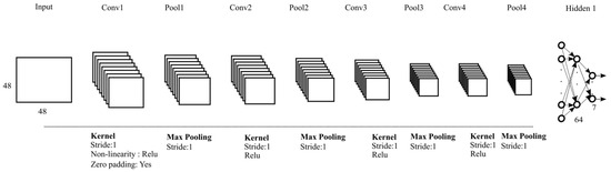 The Shallow CNN architecture consists of four convolutional and max-pooling layers (see Figure 5). First the cropped and resized faces (48 × 48 × 1) are fed to the first convolutional layer, which has 32 kernels (3 × 3), followed by a batch normalization layer [42]. In the second convolutional layer, the resultant features are then further convolved with 32 kernels, followed by another batch normalization layer and the down-sampling of the features with a max pooling (2 × 2) layer. To further minimize the impact of overfitting, drop-out regularization (0.5) [43] is employed. In the third convolutional layer, features from the second layer are convolved using 64 kernels (3 × 3) followed by batch normalization. The fourth and final convolutional layer contains 64 kernels (3 × 3), batch normalization, max pooling (2 × 2), and dropout (0.5).