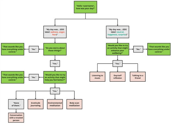 Course of the dialogue based on the emotions sadness, anger, fear, neutral, happiness and surprise. The green color represents the coach´s turns, while the gray color indicates the user´s turns. The salmon color refers to the selectable interventions.