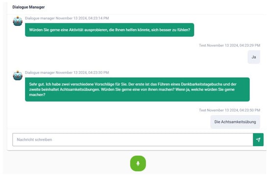 If emotions such as anger, fear, or sadness are detected, the system offers targeted assistance. It first asks about the user’s concerns (e.g., “Do you worry about those things?”) to assess their openness to the proposed interventions. The user can then choose between Gratitude Journaling or Mindfulness Exercises if they like. Each intervention is designed to address or enhance emotional well-being. An exemplary screenshot of such a dialogue in the e-VITA dashboard can be seen in Figure 12.