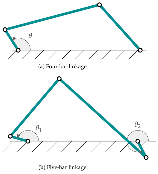 In the present work, as in previous ones [13,14,27], tests have been carried out with two types of mechanisms: an articulated quadrilateral and a five-bar linkage, which have been represented in Figure 1. The characteristic magnitudes of each one are found in Table 1 and Table 2. These mechanisms have been chosen for simplicity and to take into account the effect of several degrees of freedom.